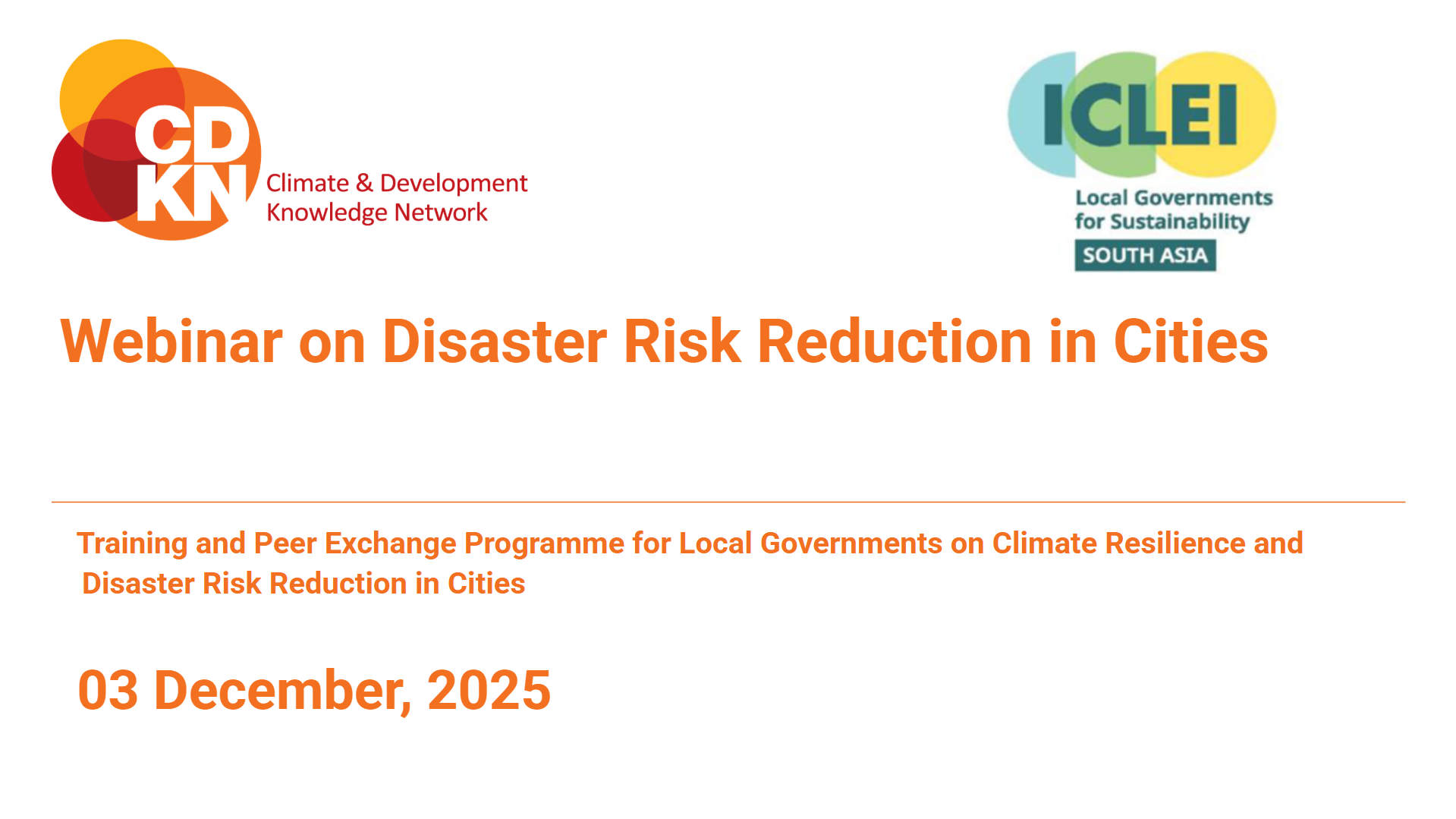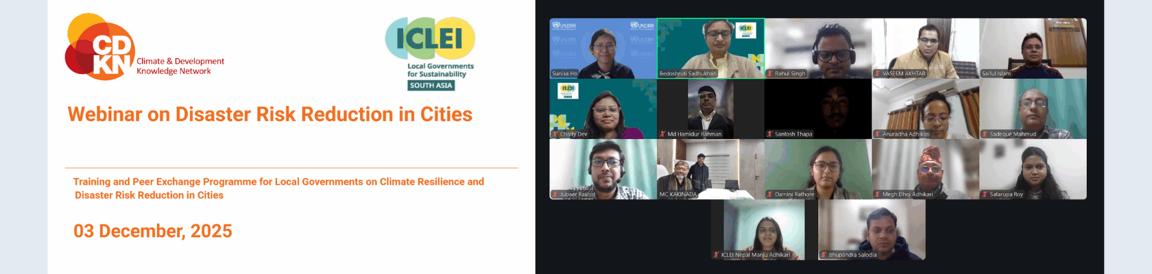 To support local governments in strengthening their disaster preparedness, ICLEI South Asia conducted a webinar on Disaster Risk Reduction (DRR) on 3 December 2025. The session was organised under the third phase of the Climate and Development Knowledge Network (CDKN) – Accelerating Inclusive Action project, supported by the Ministry of Foreign Affairs of the Netherlands and IDRC through the Step Change Initiative. The webinar was part of a year-long training and peer-learning programme on climate resilience, disaster risk management, and sustainable urban systems. It brought together 14 participants from 12 municipalities in Bangladesh, India, Nepal, and Sri Lanka, along with two expert speakers.