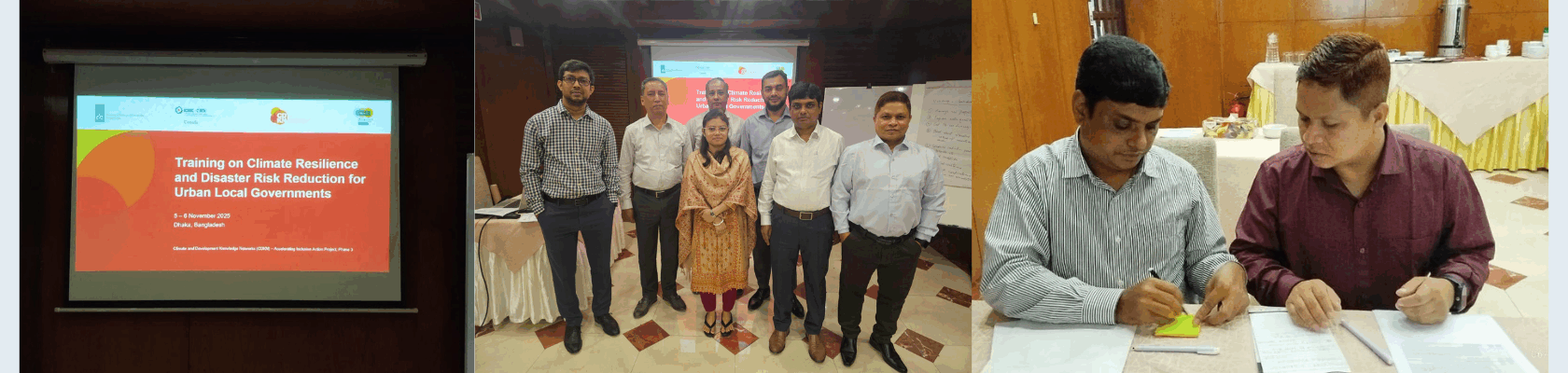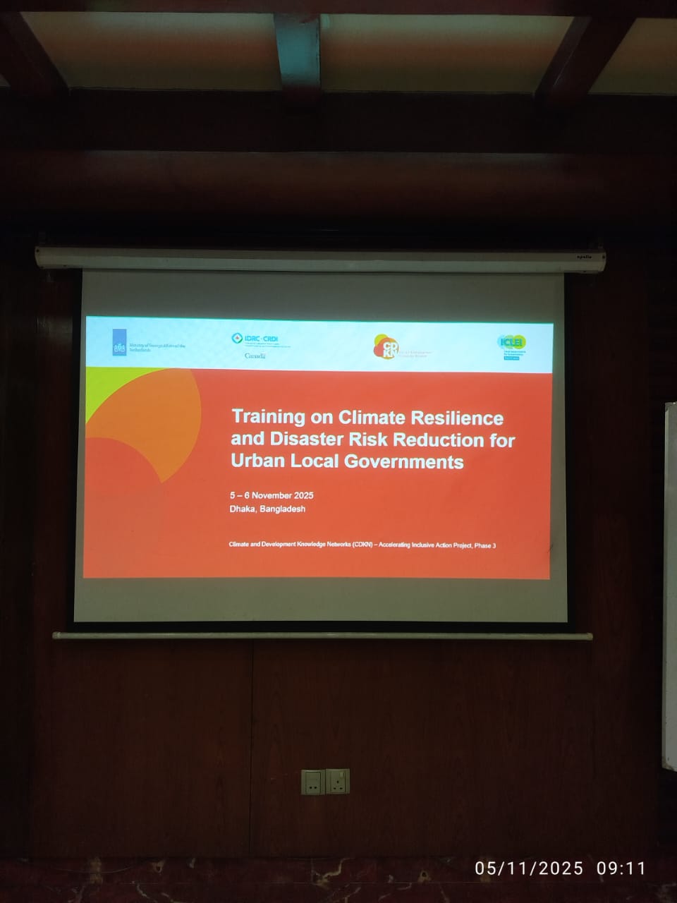 ICLEI South Asia organised a two-day training on Climate Resilience and Disaster Risk Reduction (DRR) for Urban Local Governments on 5–6 November 2025 at Nascent Gardenia, Dhaka, Bangladesh. The training was designed to equip municipalities in vulnerable regions with tools, practical knowledge, and planning approaches needed for developing and implementing climate-resilient municipal strategies.
