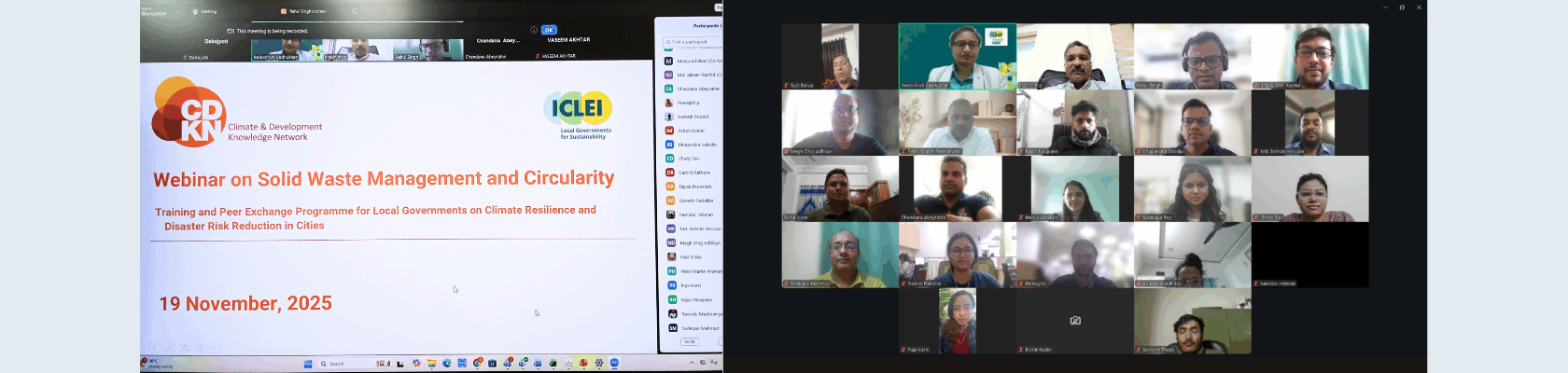 ICLEI South Asia conducted a webinar on Solid Waste Management and Circularity on 19 November 2025 for city officials from Bangladesh, India, Nepal, and Sri Lanka. This marked the beginning of a series of webinars under CDKN Asia’s year-long training and peer exchange programme for local governments on climate resilience and disaster risk reduction, and sustainable solid waste management in cities. The programme is being implemented under the third phase of the ‘Climate and Development Knowledge Network (CDKN) – Accelerating Inclusive Action’ project, supported and funded by the Ministry of Foreign Affairs of the Netherlands and IDRC through the Step Change Initiative.