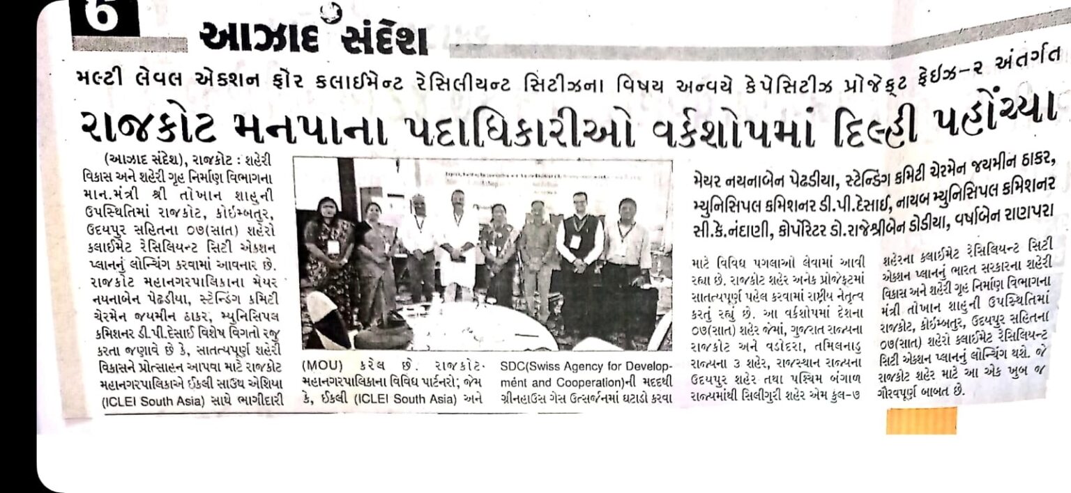 - The workshop saw a high level panel discussion moderated by ICLEI South Asia, where key project city representatives including the Commissioner of Rajkot Municipal Corporation, Deputy Commissioner of Ahmedabad Corporation, Executive Engineer, Directorate of Local Bodies, Government of Rajasthan, General Manager (Smart Cities), Coimbatore City Municipal Corporation and the Chief Executive Officer from Tamil Nadu Green Climate Company highlighted some enabling factors driving local climate action in their cities.