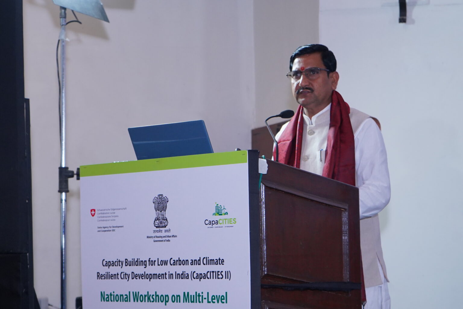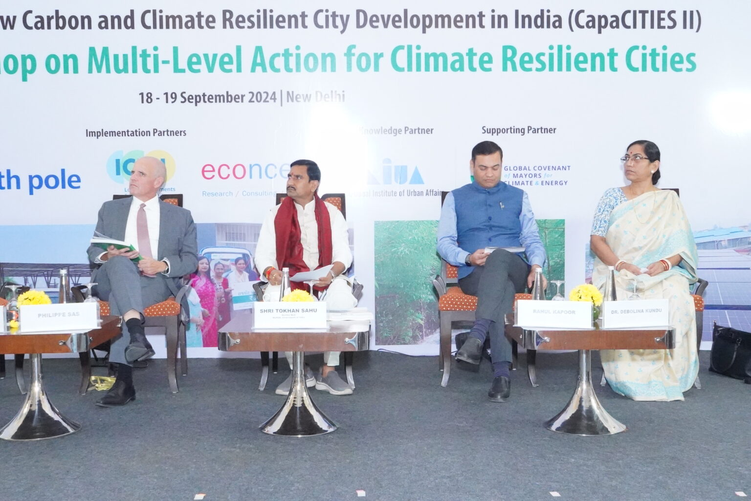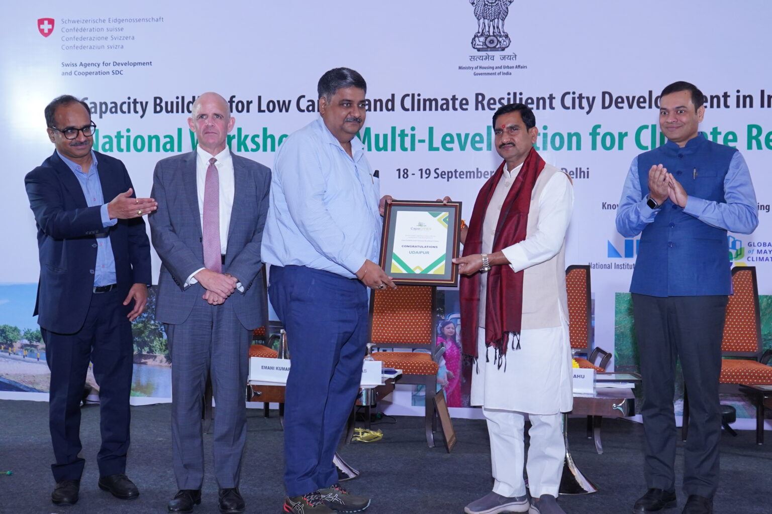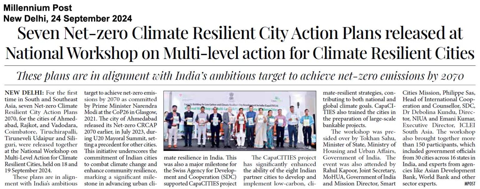 - The key highlight of the event was the Launch of the 7+1 Climate resilient city action plans, presided over by Shri Tokhan Sahu, Hon’ble Minister of State, Ministry of Housing and Urban Affairs, Government of India. The launch was also attended by Shri Rahul Kapoor, Joint Secretary, MoHUA, Government of India and Mission Director, Smart Cities Mission, Shri Philippe Sas, Head of International Cooperation and Counsellor, SDC, Dr Debolina Kundu, Director, NIUA.