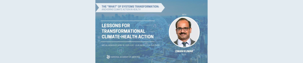 Emani Kumar, Deputy Secretary General of ICLEI and Executive Director, ICLEI South Asia, was invited by the U.S. National Academy of Medicine (NAM) to speak at its global workshop titled “The ‘What’ of Systems Transformation: Anchoring Climate Action in Health,” held virtually on 29 and 30 April 2025. The workshop was the first of a […]