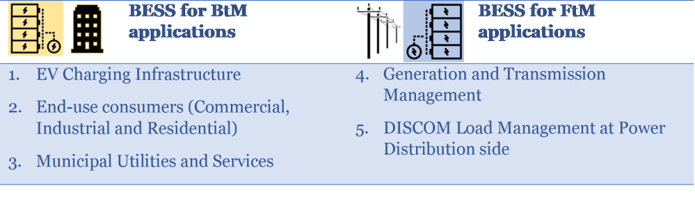For these shortlisted use-cases, an assessment framework was developed to assist stakeholders in preliminary scoping of BESS deployment and pre-feasibility analysis was undertaken. BESS was seen to offer multiple benefits across applications, including reduction in peak demand of facilities, maximising self-consumption from RE generation, provision of power backup during grid outages and help to reduce load on distribution transformers. It was found to have good potential for end-consumers such as municipal utilities, commercial and industrial facilities with high energy demand, especially when deployed alongside RE systems and where there are large-size standby diesel generator sets. On the power distribution side, BESS has value for DISCOMs for managing peak loads and deferring investments in network upgrades.